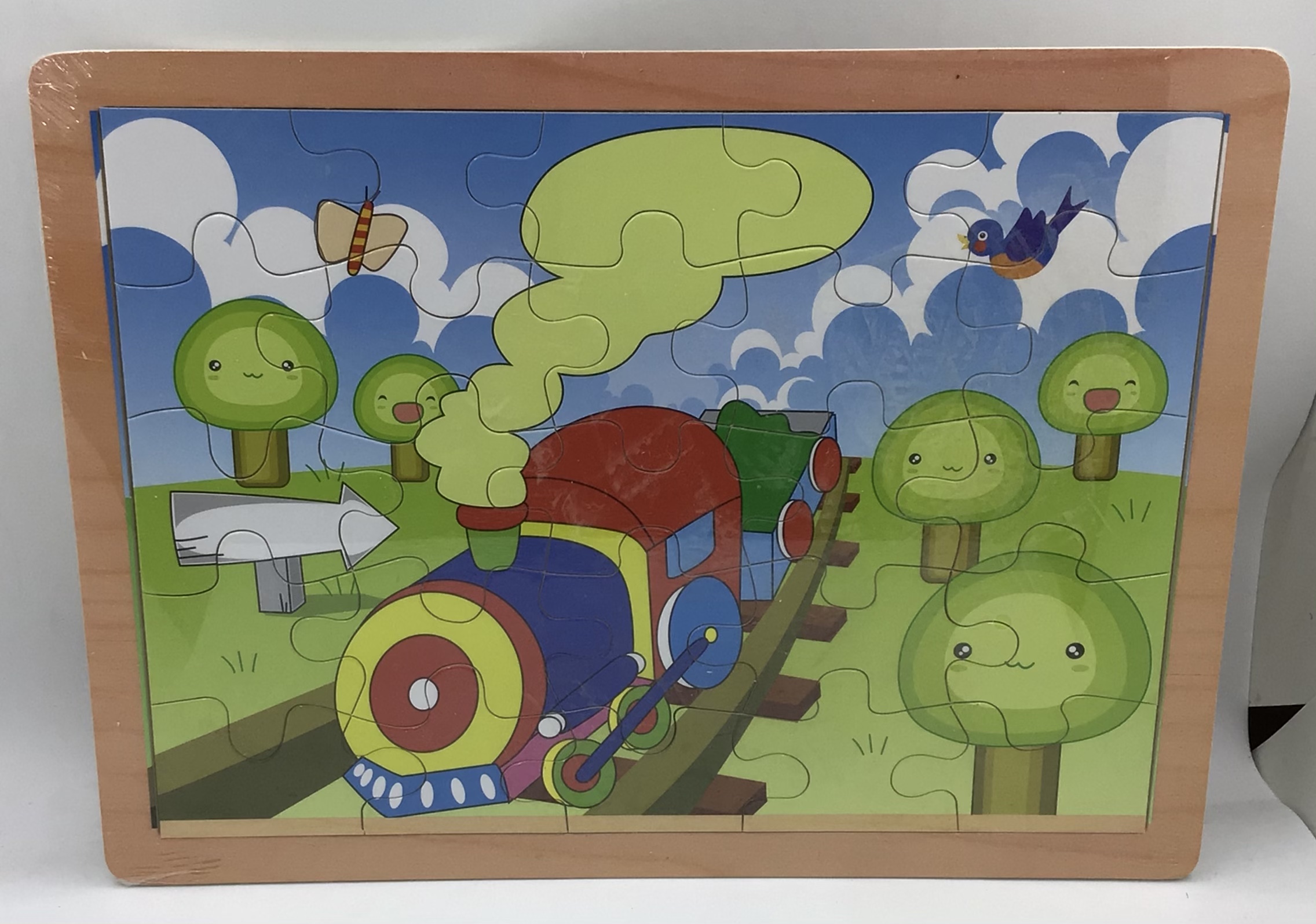Puzzle din lemn educativ având ca tematică diverse activități cum ar fi animăluțele de casă locomotivă de tren mișcare și insecte acest puzzle este frumos colorat sinusuri de construit